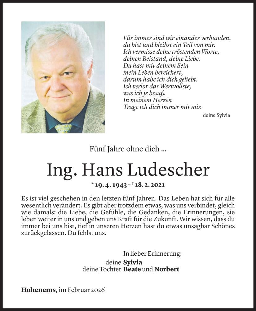 Hier finden Sie alle Todesanzeigen aus der Zeitung, die bisher für Hans Ludescher erschienen sind.