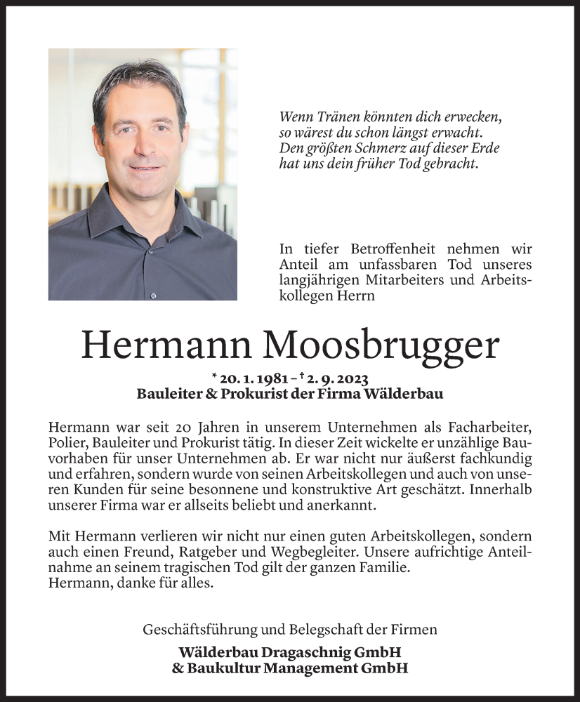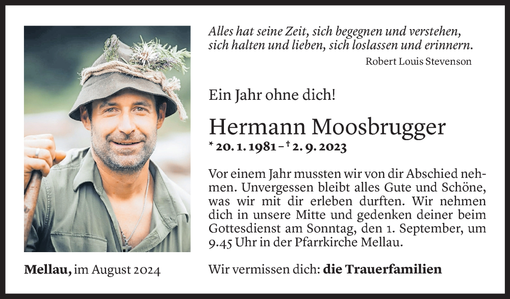 Hier finden Sie alle Todesanzeigen aus der Zeitung, die bisher für Hermann Moosbrugger erschienen sind.