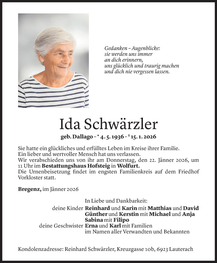 Hier finden Sie alle Todesanzeigen aus der Zeitung, die bisher für Ida Schwärzler erschienen sind.