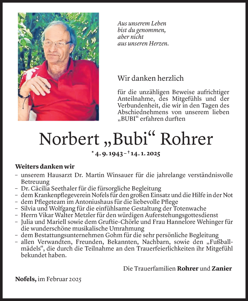 Hier finden Sie alle Todesanzeigen aus der Zeitung, die bisher für Norbert Rohrer erschienen sind.
